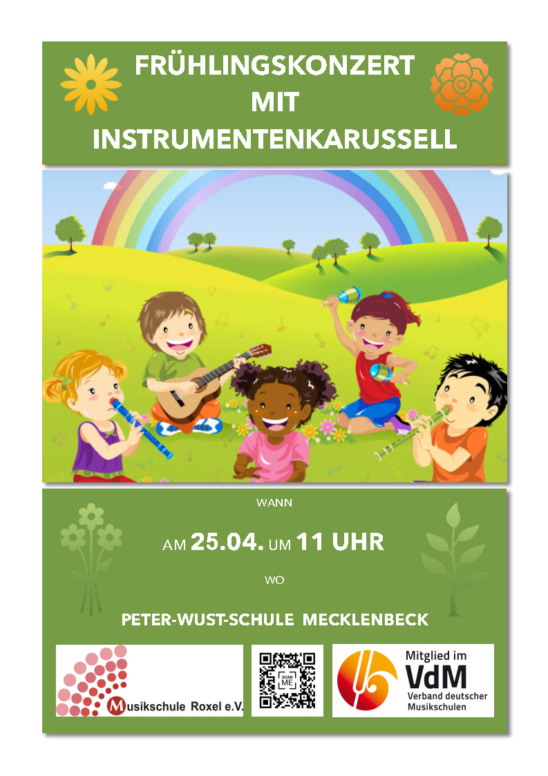 Im Anschluss an das Konzert findet ab 12.00 Uhr für alle Interessierte, gern auch aus Roxel und Sentrup, ein Instrumentenkarussell in den Räumen der Schule statt, wo alle vorher vorgestellten Instrumente nach Herzenslust ausprobiert werden können.